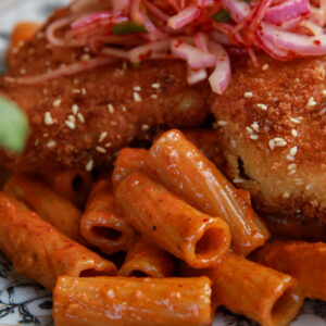 A creamy, spicy pasta inspired by budalk carbonara ramen made with gochujang and Parmesan, topped with crispy sesame chicken and quick pickled onions. The heat is adjustable, making it easy to customize for the whole family.