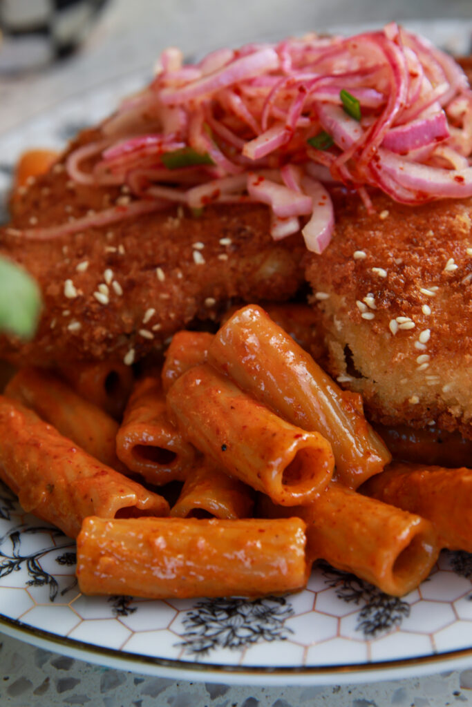 The sauce is creamy and has a little heat, but it’s not overwhelming. The crispy chicken adds that contrast, and the pickled onions just take the whole thing over the top in the best way possible, I also like that it’s flexible. You can make it spicier, keep it more mild, switch the pasta, or even use ramen if you want to lean into the original idea more.