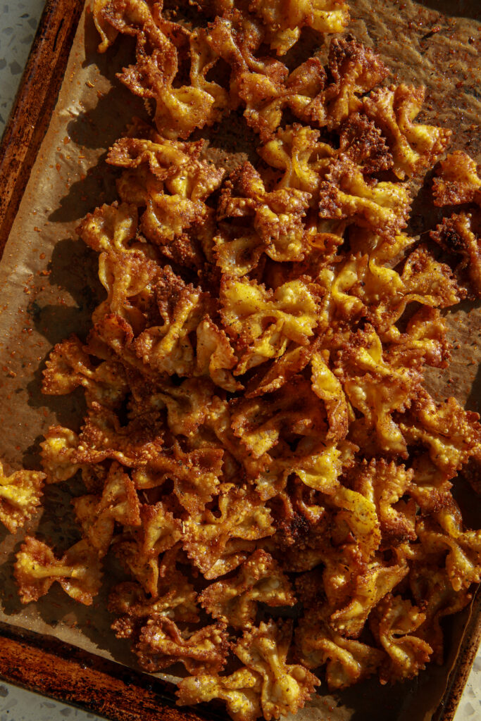 - Spread onto a baking sheet or air fryer basket in a single layer. Roast at 390°F for 20–25 minutes, turning a few times, until deeply golden and crisp. The pasta should snap when you break it.
